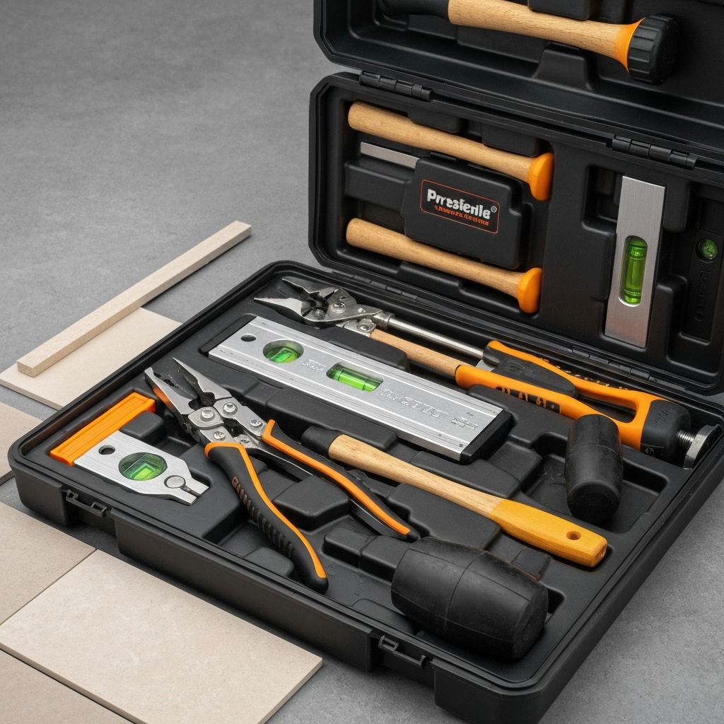 Complete set of professional tile installation tools including cutters, trowels, and levelers